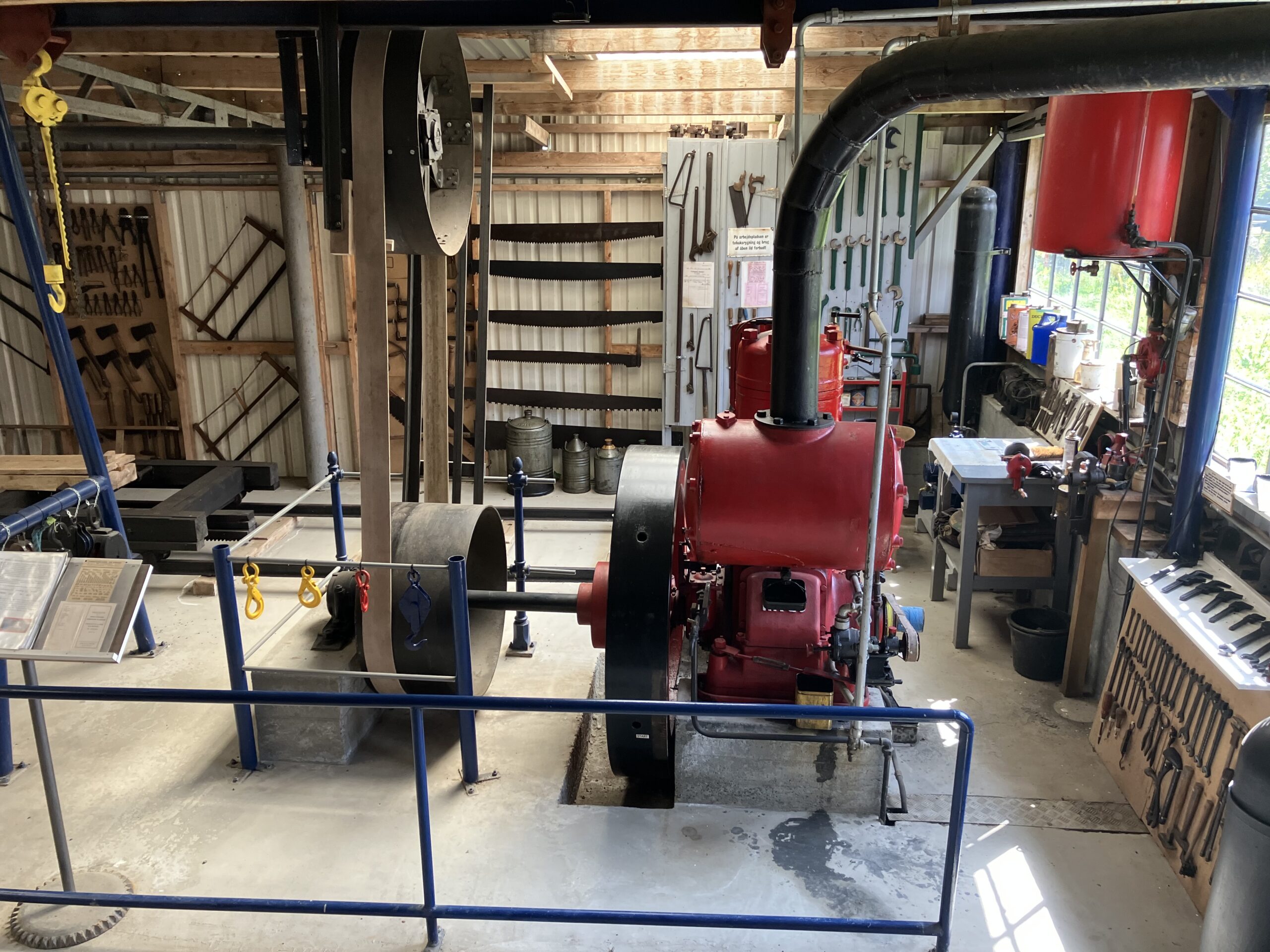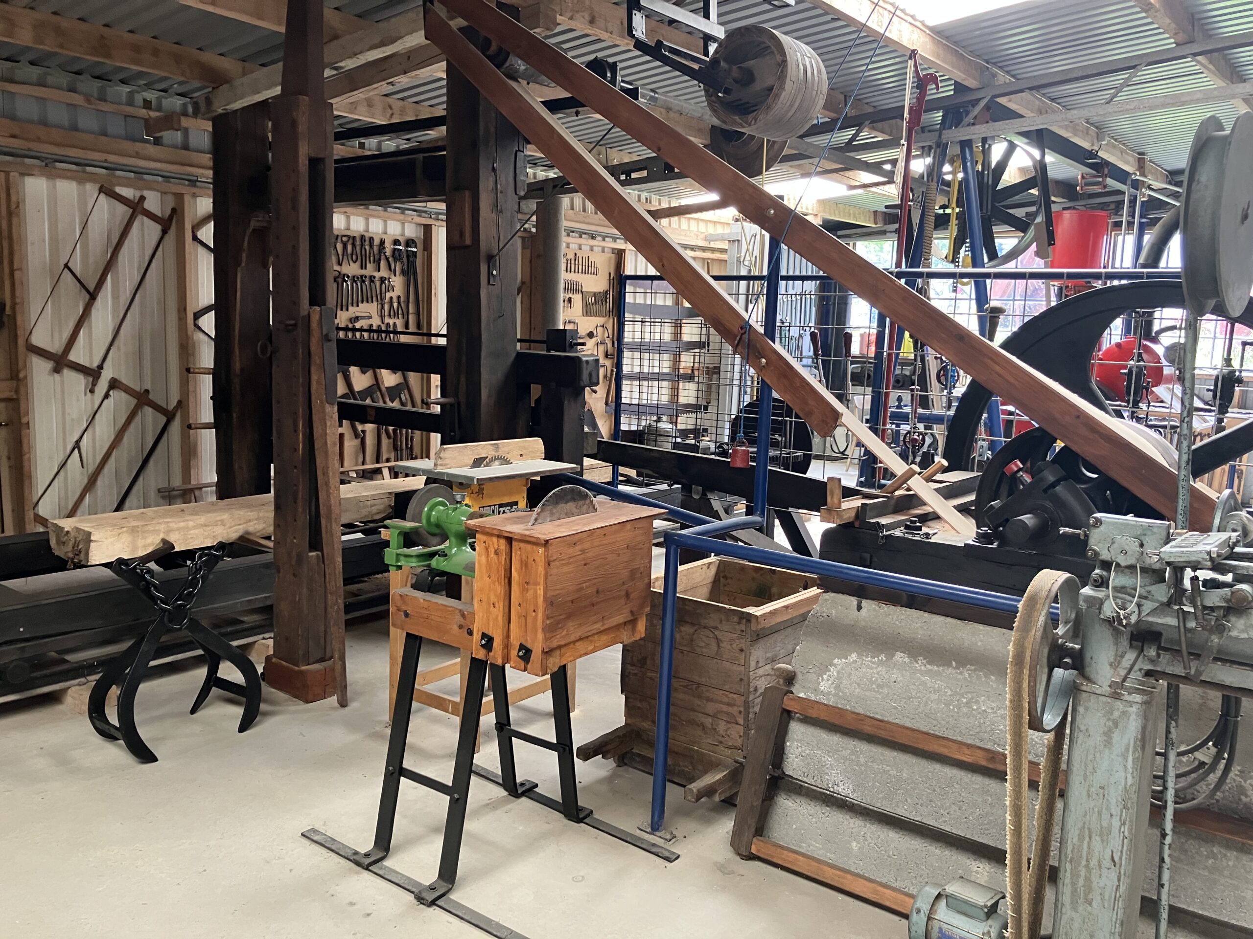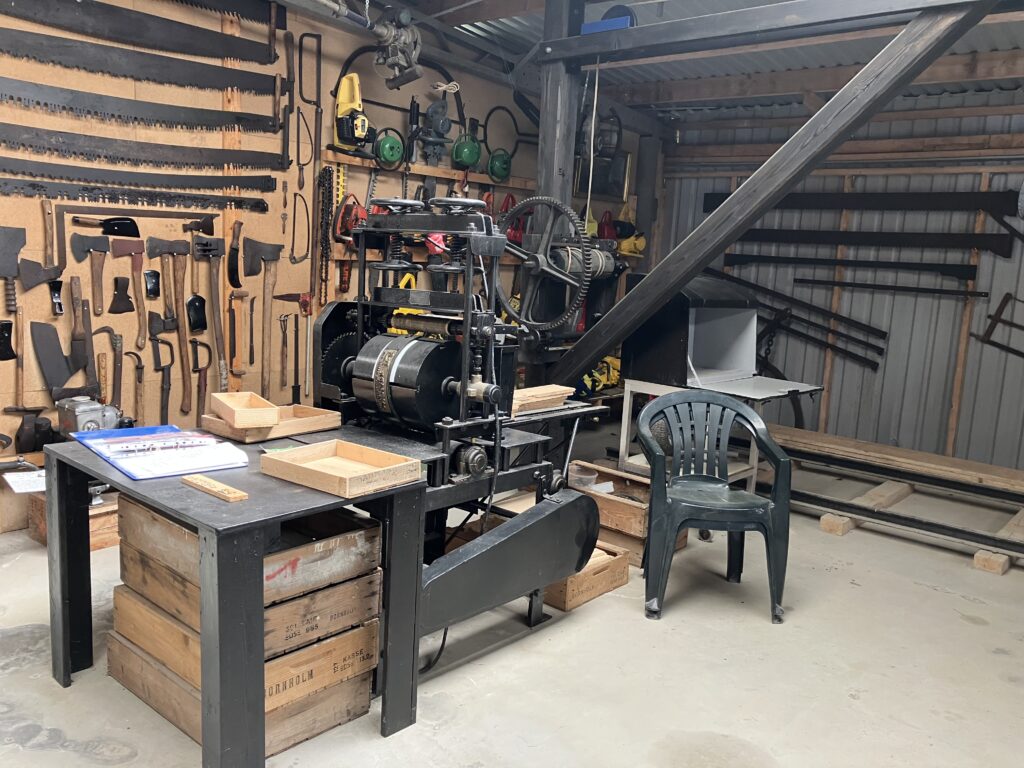 Først har vi det store savværk, der gennemsaver hele træstammer på langs. Af og til opstarter en af vore smede savværket for vore gæster, dette sker som regel om formiddagen.